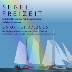 Vom 26.-31.7. fahren wir ans niederländische Ijsselmeer und hissen dort zusammen die Segel. Mit dem imposanten Dreimaster "Nil Desperandum" werden wir von Hafen zu Hafen segeln, die umliegenden Städte, die Gruppe und und uns selbst besser kennenlernen. Euch erwartet ein buntes Programm an Land und zu Wasser.