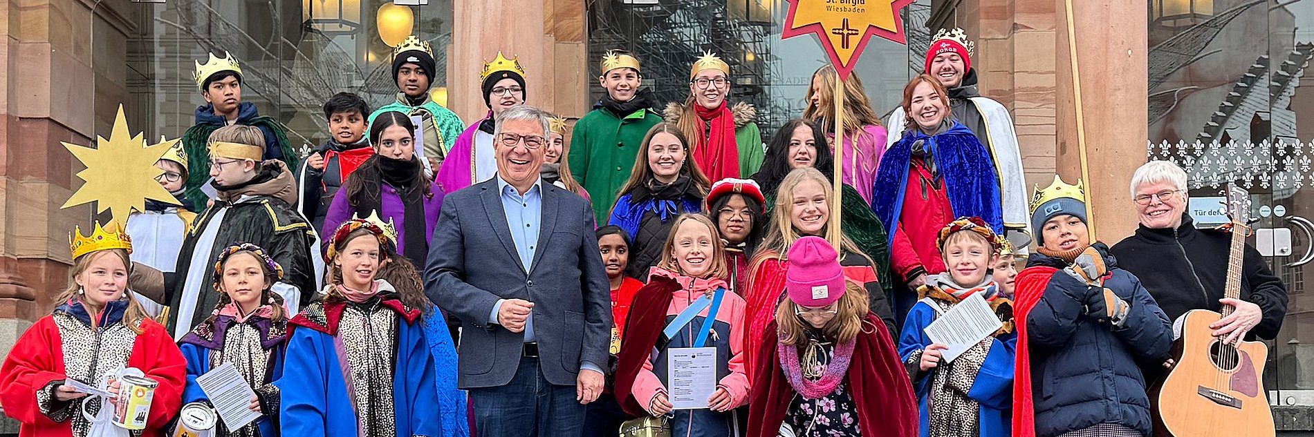 Die rund 30 Kinder und Jugendlichen kamen aus den drei Wiesbadener katholischen Pfarreien St. Bonifatius, St. Birgid sowie St. Peter und Paul. Sie brachten ihren Segen an der Rathauspforte an, „C+M+B - Christus mansionem benedicat - Christus segne dieses Haus“.