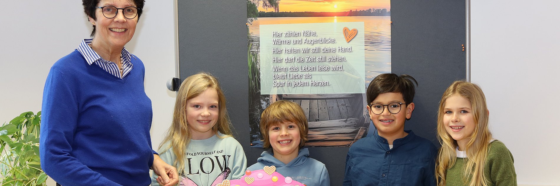 Dorothea Ahlers, Vorstandsvorsitzende der Hospizstiftung Idsteiner Land, strahlt über beide Wangen, als ihr Diego, Isabella, Konrad und Maya einen symbolischen Spendenscheck in Muffinform in Höhe von 1500 Euro für die Arbeit der Stiftung überreichen. Die zwei Mädchen und zwei Jungen stehen stellvertretend für alle Erstkommunionkinder der Katholischen Pfarrei St. Martin Idsteiner Land, die an der Aktion „Erstkommunionkinder backen fürs Hospiz“ teilnahmen. Am 8. Februar stellten sich die Kokis vor und verteilten im Anschluss an den Gottesdienst in Idstein liebevoll einzeln verpackte Muffins. In Niedernhausen servierten sie mit Unterstützung des Ortsausschusses Maria Königin Waffeln.