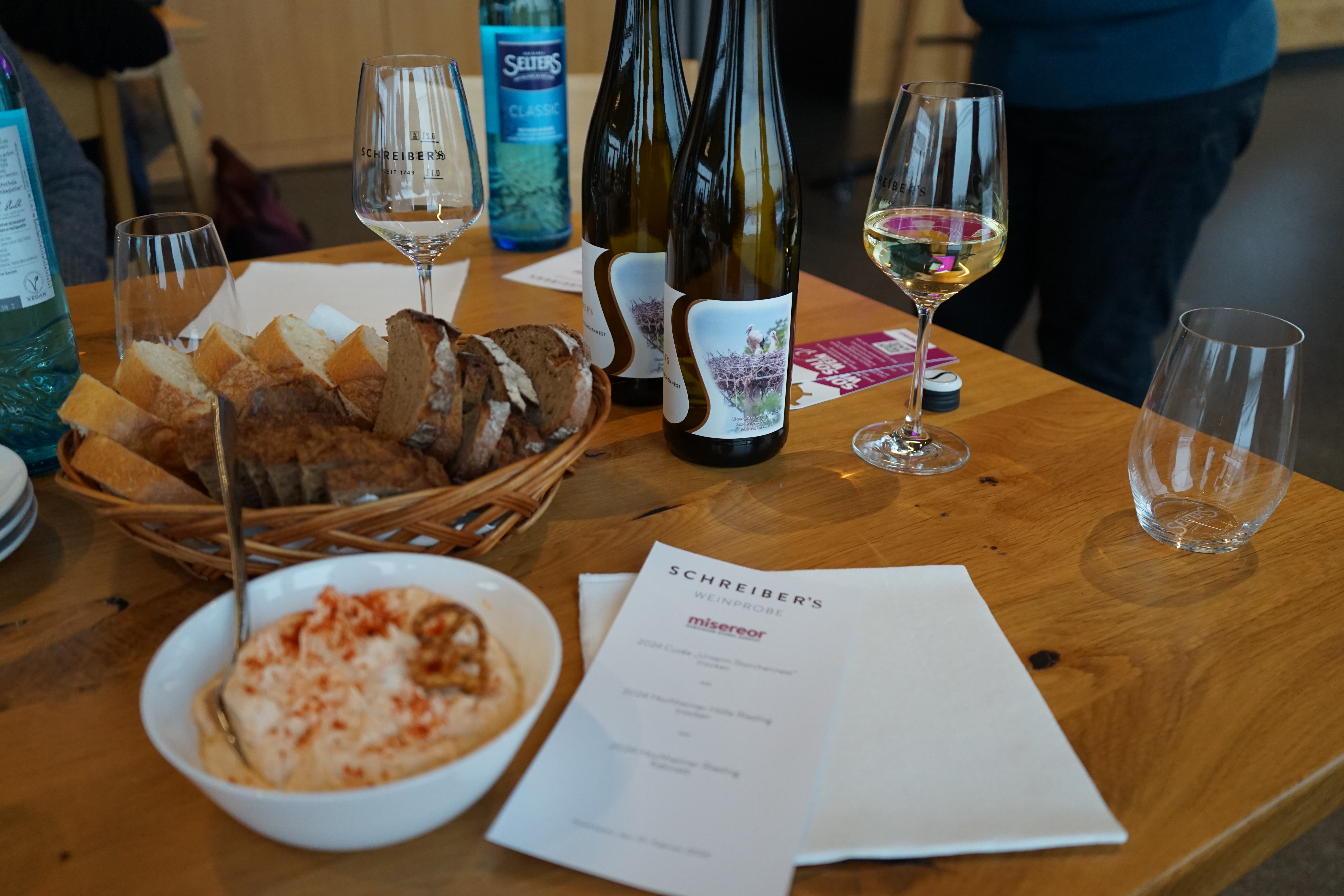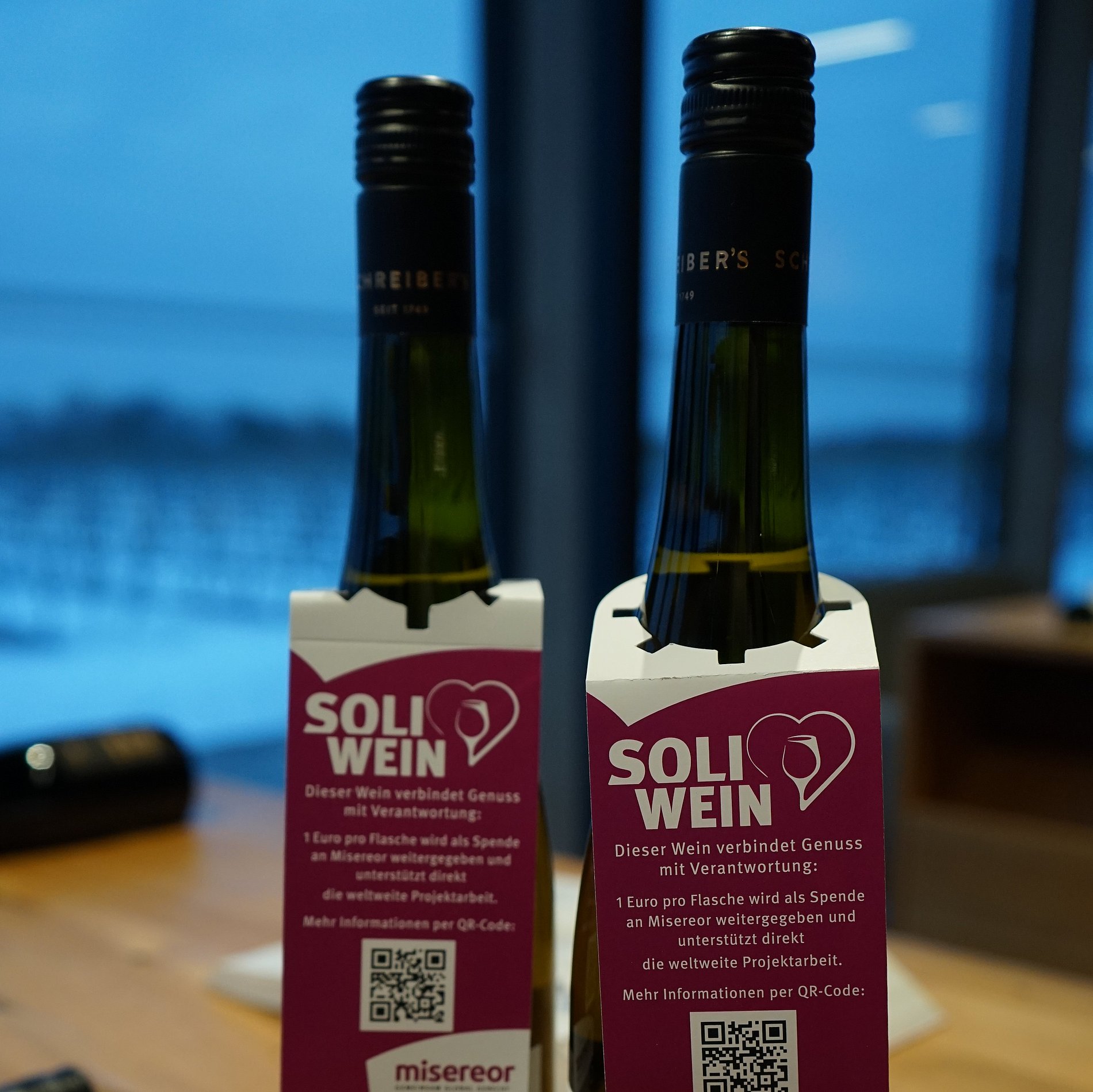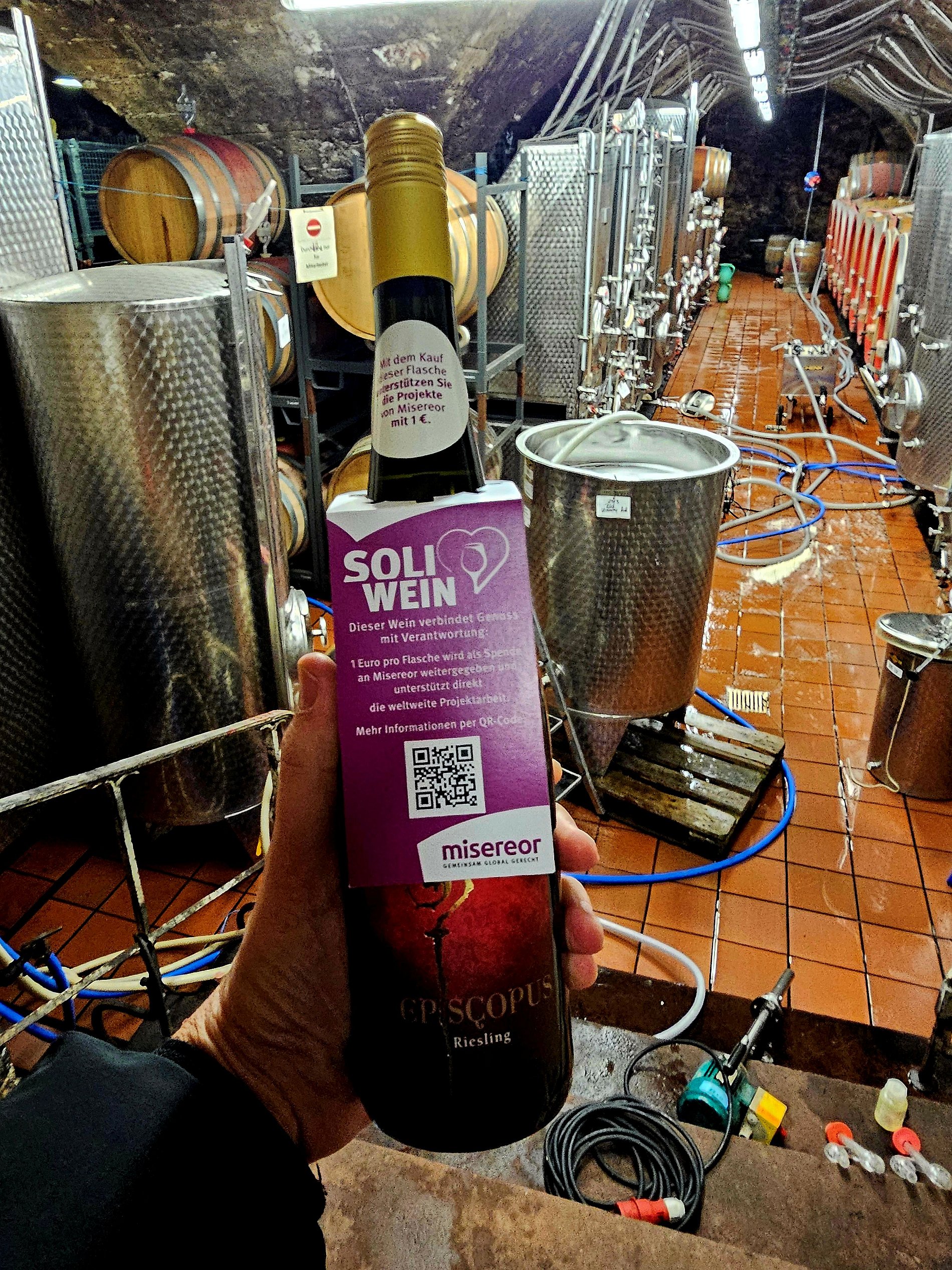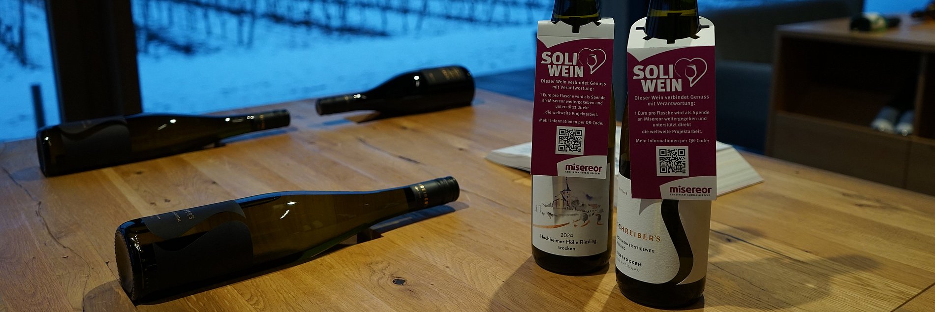 Im Rahmen einer Weinprobe im Weingut Schreiber´s startete nicht nur die Misereor-Soli-Wein-Aktion, an dem Abend wurden auch gleich zwei Soli-Weine verkostet. Probiert wurde ein fruchtiger Hochheimer Riesling Kabinett des Weingut Schreiber´s und ein trockener Riesling der Pfarrei St. Teresa am Main. Das Pfarrgut ist seit Jahrzehnten an das Familienunternehmen Schreiber verpachtet. Die Pacht lässt sich die Pfarrei in Wein statt in Geld auszahlen und darf selbst entscheiden, ob ein trockener oder halbtrockener Wein produziert wird. Auf die Flaschen wird sogar ein eigenes Pfarrei-Etikett geklebt. Der Soli-Wein kann über die Pfarrei bezogen werden.